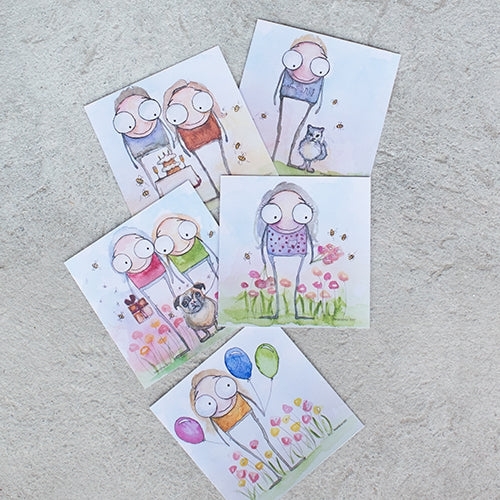 10 flotte og morsomme kort malt av Lena Vistnes, eksklusivt for Bambooa. Pakken inneholder 5 motiver.