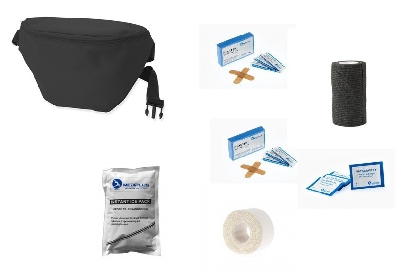 Smart rumpetaske med et førstehjelpsinnhold som bør være tilgjengelig i alle aktive hjem. Minste bestilling 20 stk. Pris pr stk kr. 125,- inkl. mva. Eventuelle trykkostnader kommer i tillegg.