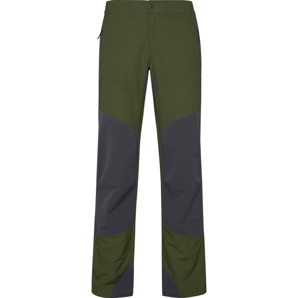 Kombinasjon av to materialer, hvorav ett med elastan, i to farger. Trykknapp og glidelåslukking. Sidelommer med omvendte glidelåser og drahåndtak. Baklomme med omvendt glidelås og drahåndtak. Beltehemper. Elastisk linning bak. Elastiske justeringer nederst på bena. Knellegg for bedre ergonomi.